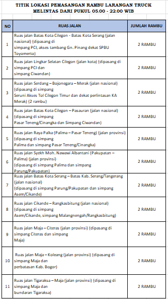 Selain pengawasan langsung, Dinas Perhubungan Provinsi Banten juga menyiapkan pemasangan 22 unit rambu larangan masuk bagi kendaraan tambang di 11 ruas jalan provinsi dan nasional yang menjadi jalur rawan. Pemasangan dilakukan di titik-titik penting seperti Simpang PCI dan Ciwandan di Cilegon, Palima dan Pasar Teneng di Serang, hingga Maja dan Citeras di Lebak.